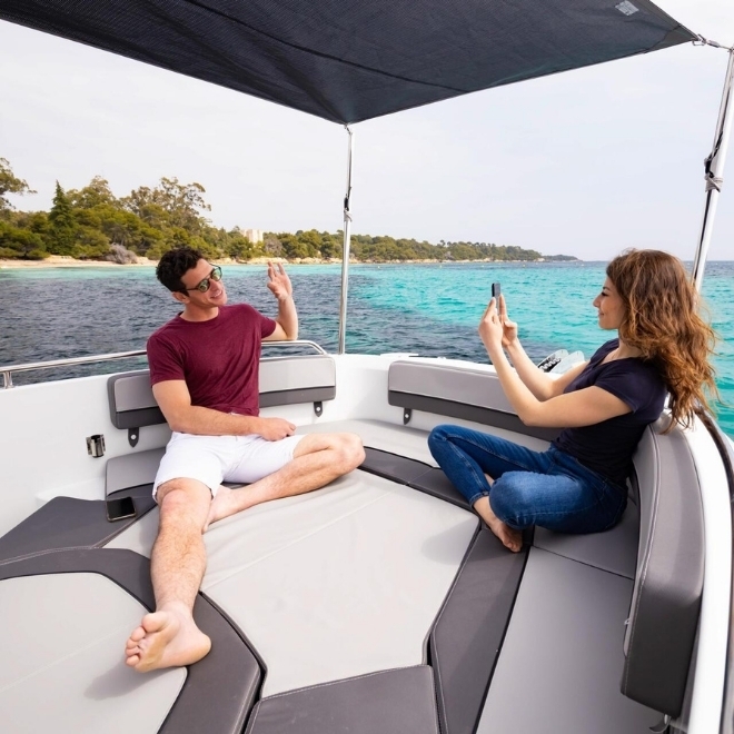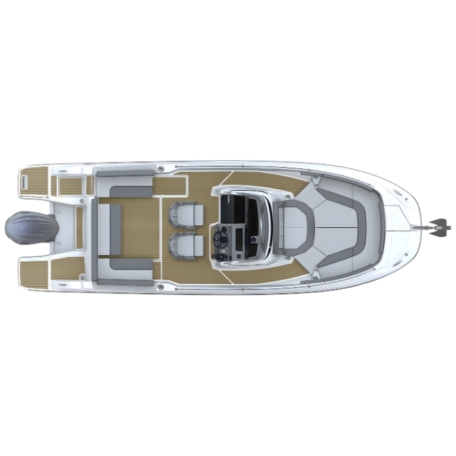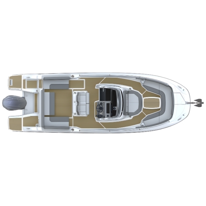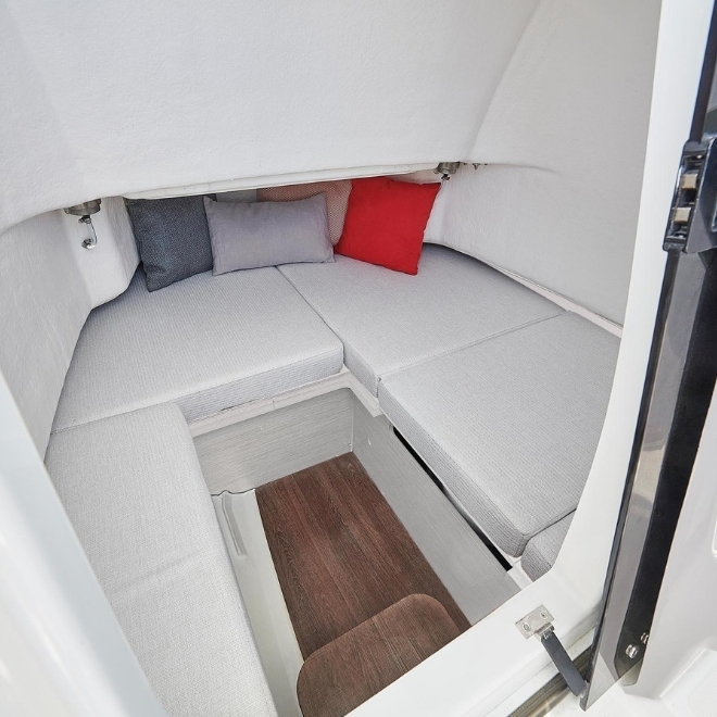Ambarcațiunea pune accent pe funcționalitate și libertate de mișcare pe punte. Cockpitul este spațios și configurabil, oferind acces facil în jurul consolei centrale, platforme de baie integrate și spații inteligente de depozitare. Consola ergonomica permite un control precis al ambarcațiunii, iar finisajele premium asigură confort și durabilitate.